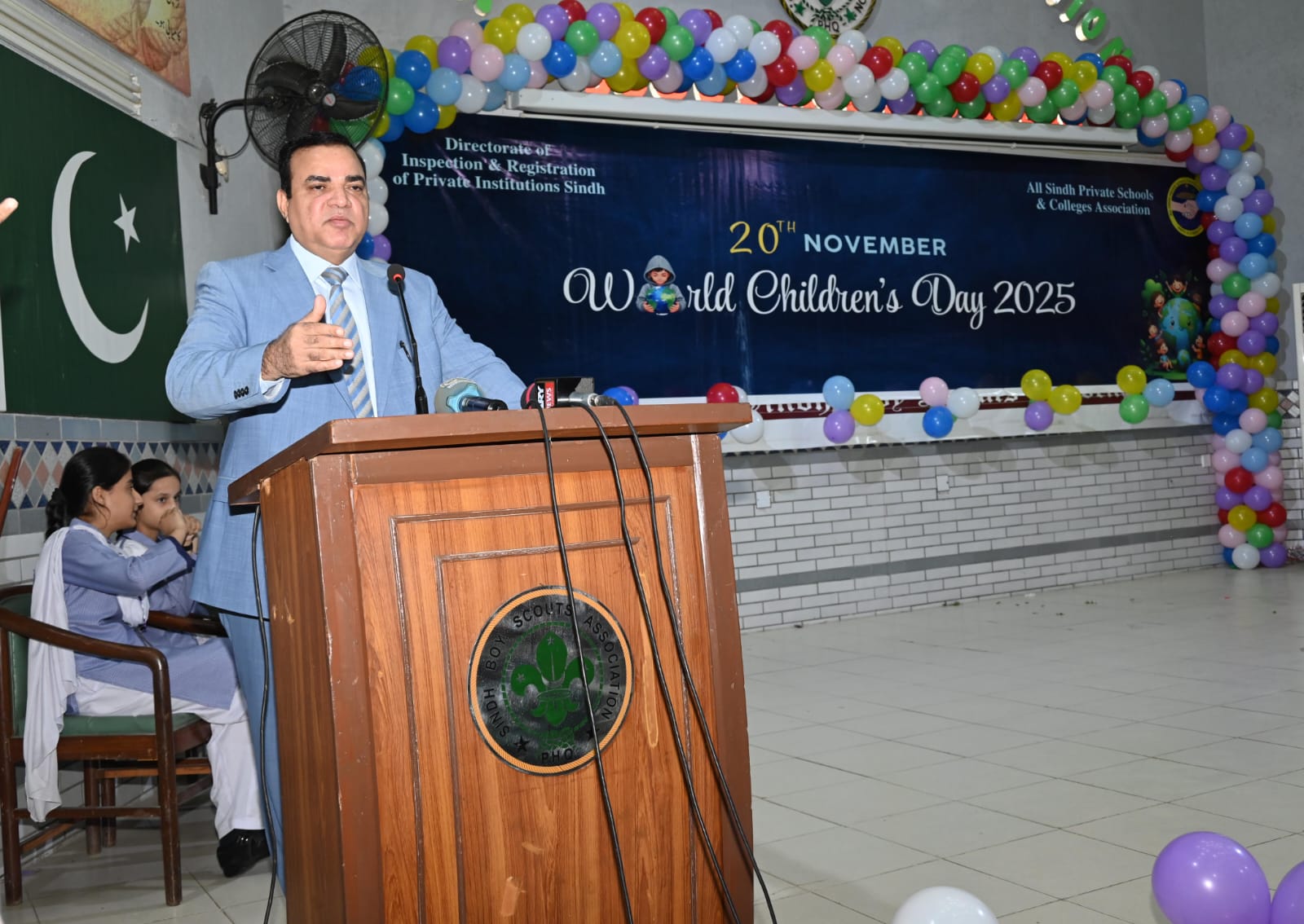 پریس ریلیز برائے ایجوکیشن ڈیسک ورلڈ چلڈرنز ڈے 20 نومبر 2025 ڈائریکٹوریٹ پرائیویٹ انسٹیٹیوشنز سندھ کے زیر انتظام، آل سندھ پرائیویٹ اسکولز اینڈ کالجز ایسوسی ایشن کے اشتراک سے 17 تا 20 نومبر سندھ بھر کے تعلیمی اداروں میں آل سندھ تھیم بیسڈ چلڈرن ویک منایا گیا مرکزی تقریب کراچی میں پورے جوش و جذبے سے منعقد کی گئی ورلڈ چلڈرنز ڈے کے موقع پر ہونے والی مرکزی تقریب کے مہمان خصوصی سیکرٹری اسکولز ایجوکیشن سندھ زاہد علی عباسی جبکہ اعزازی مہمانوں میں چئیرمین بورڈ آف انٹرمیڈیٹ ایجوکیشن کراچی فقیر محمد لاکھو ،ڈائریکٹر جنرل پرائیویٹ انسٹیٹیوشنز سندھ پروفیسر افضال انصاری ایڈیشنل ڈائریکٹر رفیعہ جاوید، مانیٹرنگ آفیسر اخلاق احمد،ایڈیشنل ڈائریکٹر کالجز پروفیسر گلاب رائے،ڈپٹی ڈائریکٹر پرائیویٹ انسٹیٹیوشنز قربان علی بھٹو ،ایسوسی ایشن کے چیئرمین حیدرعلی اور مرکزی رہنما شامل تھے۔ تقریب میں اسکولوں اور کالجوں کے اساتذہ اور طلبہ و طالبات نے کثیر تعداد میں شرکت کی تقریب میں پورے ہفتے پر مشتمل موضوعات کا احاطہ کیا گیا جس میں بچوں کے صحت و تحفظ کے حقوق، تعلیمی حقوق، معاشرتی حقوق، ماحولیاتی حقوق۔اور سماجی انصاف کے حقوق شامل تھے مہمان خصوصی سیکرٹری اسکولز ایجوکیشن سندھ زاہد علی عباسی نے اپنے خطاب میں کہا کہ بچے ہمارا مستقبل ہیں ان کے حقوق پر توجہ مرکوز کر کے آنے والے مسائل کا حل نکالا جا سکتا ہے چئیرمین بورڈ آف انٹرمیڈیٹ ایجوکیشن کراچی کے چیئرمین فقیر محمد لاکھو نے کہا کہ ہر صاحب حیثیت کو ایک بچے کی تعلیمی کفالت کی ذمہ داری لینی چاہیے۔ ایڈیشنل ڈائریکٹر پرائیویٹ انسٹیٹیوشنز سندھ رفیعہ جاوید نے کہا کہ بچوں کے عالمی دن کا مقصد یہ ہے کہ ہر بچے کے بنیادی حقوق کی ضمانت دی جائے۔جسمانی سزا، ہراسمنٹ ،اور منشیات جیسے سنگین معاملات کو دیکھنے کے لیے اداروں، گھر اور معاشرے کو مل کر کام کرنا ہوگا۔ ایسوسی ایشن کے چیئرمین حیدرعلی نے کہا کہ آج کے دن بچوں کے حقوق کے ساتھ ساتھ بڑوں کی ذمہ داریوں کو اجاگر کرنے کی ضرورت ہے۔ ایسوسی ایشن کے سیکرٹری جنرل دوست محمد دانش، سینئر وائس چیئرمین مرتضی شاہ، وائس چیئرمین پروفیسر توصیف شاہ،مرکزی رہنما اعجاز کاشف، محمد ساجد، اشفاق حسین، شہاب اقبال، نعمان رضا، امتیاز ڈوگر طاہرہ منصور ،منور علی عادل بلوچ، خان محمد، امتیاز صدیقی، زبیر بلوچ اور دیگر ایگزیکٹو ممبران بھی موجود تھے.